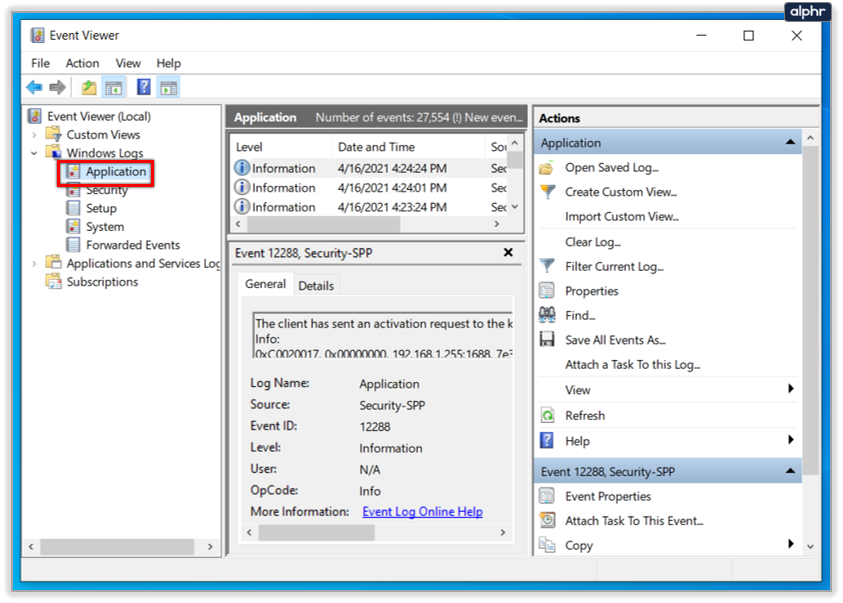 - Click Application in the left pane and scan the logs in the center pane. Troubleshoot problems as you find them.