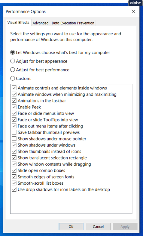 - Select Settings in the Performance section and then select Custom or best performance. If you select Custom, uncheck the boxes next to effects you could happily live without.