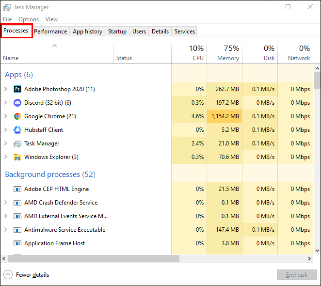 - Ensure the “Processes” tab is selected. You’ll see a list of apps and background processes.