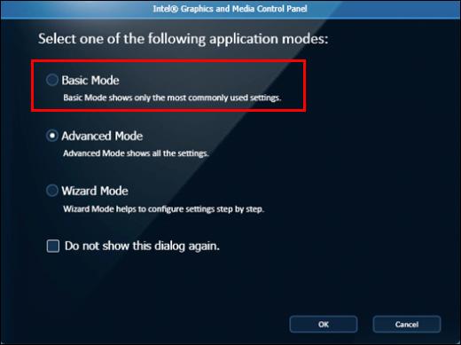 - Select “Basic Mode” in the Intel Graphics and Media Control Panel.