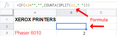 As you can see above, cell A3 has two words. Here is the breakdown of the formula used, which was “=COUNTA(SPLIT(A3, ” “)).”