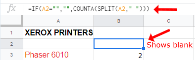 - Highlight the blank cell where you want to display your results and paste the following formula: =IF(A2=””,””,COUNTA(SPLIT(A2,” “))) where “A2” specifies the cell to be counted.