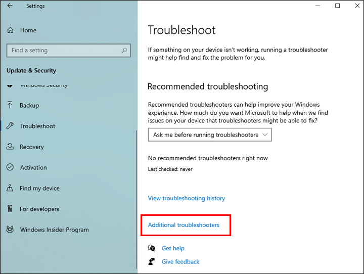 - Search for and click on “Troubleshoot Settings” and then look for “Additional Troubleshooters.”