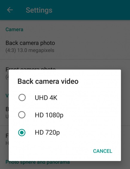 You can change the video resolution before you start by tapping on the Settings icon in your Camera app. For the back camera, you can choose between 720p HD, 1080p Full HD, and 4K Ultra HD.