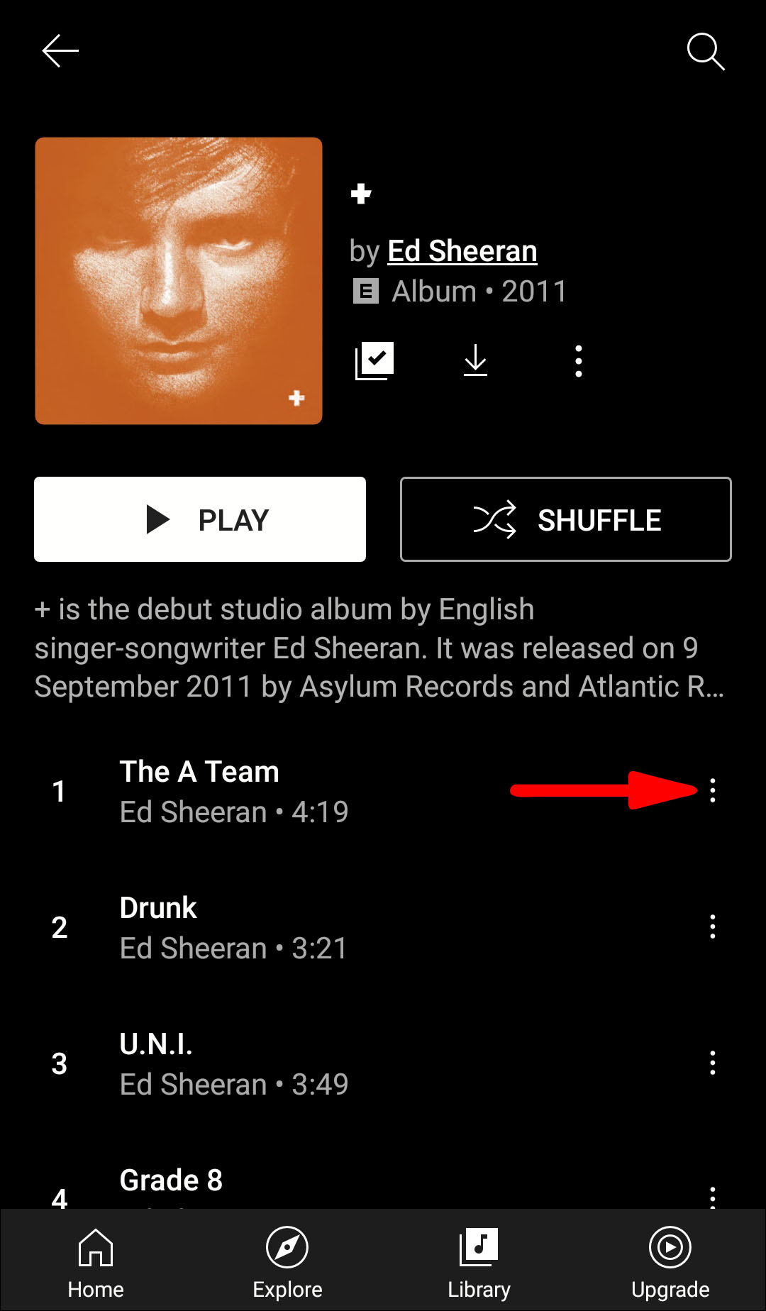 - Find the album you want to listen to and click on the menu button next to it.