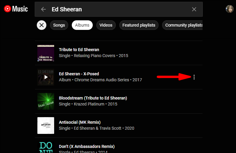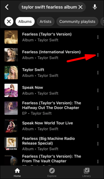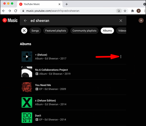 - From the search results, tap on the menu button next to the album.