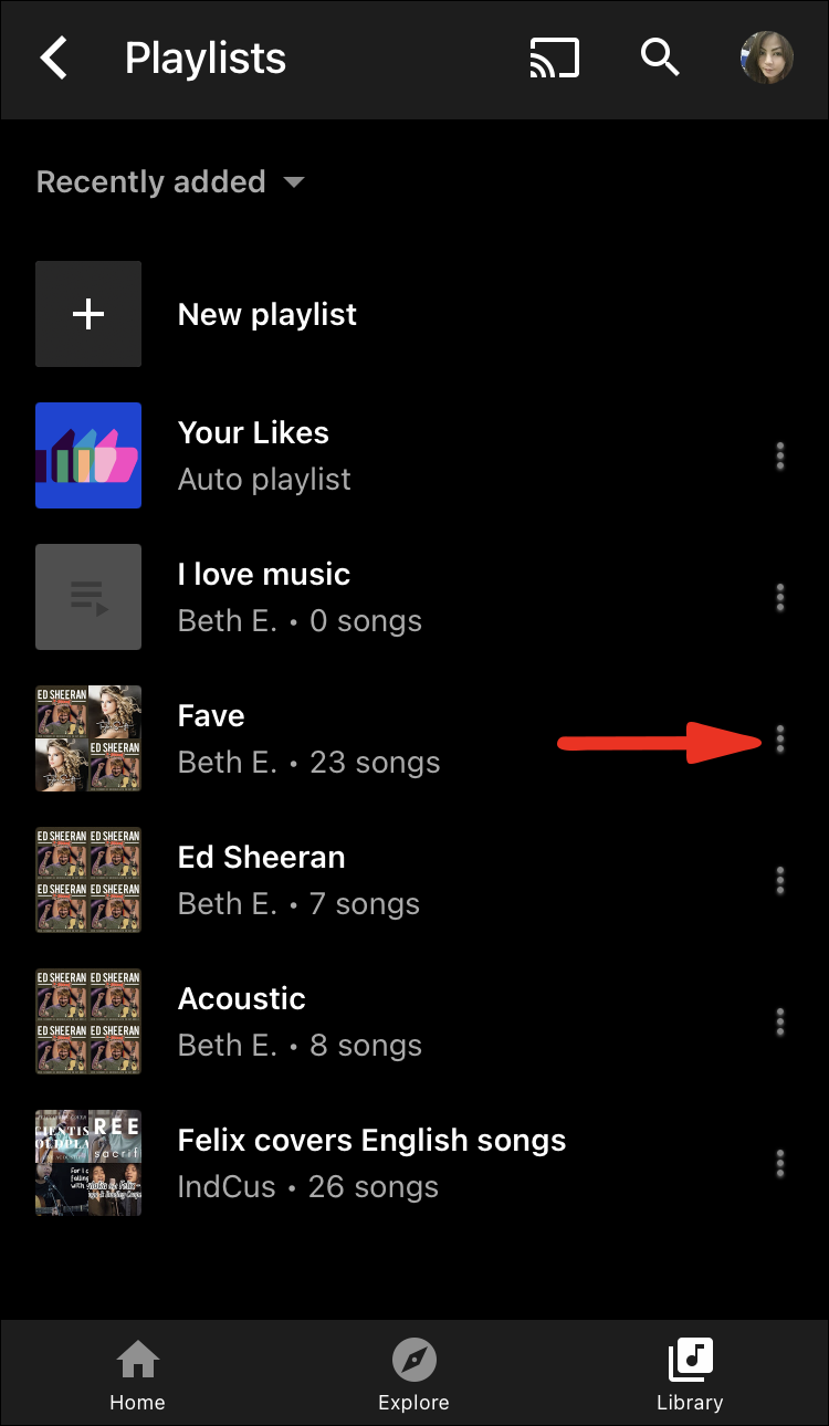 - Tap on the menu button next to the YouTube Music playlist you want to edit.