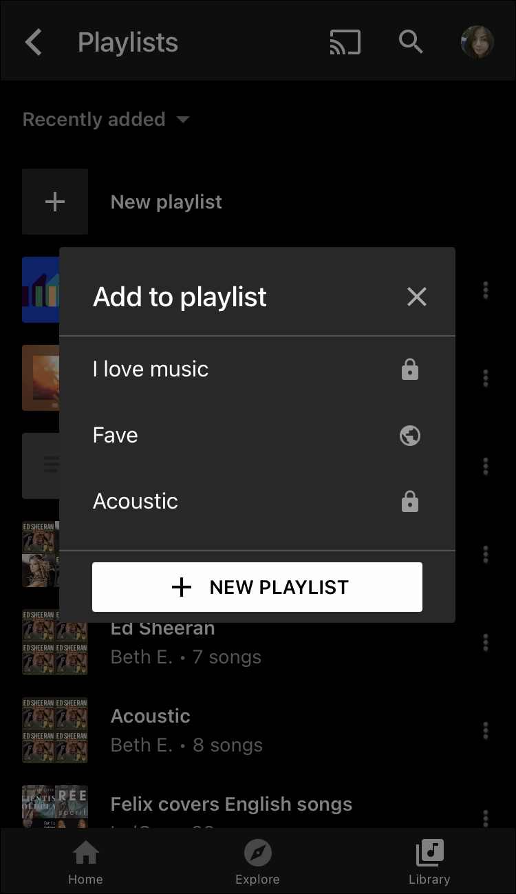 Then select the “Add to playlist” option from the menu. Tap on the “+ New Playlist” button and add the name and privacy settings for the playlist.
