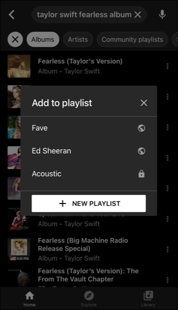 - Search for the album you want to add to a playlist. Tap on the “Album” tab to narrow down your search if necessary.