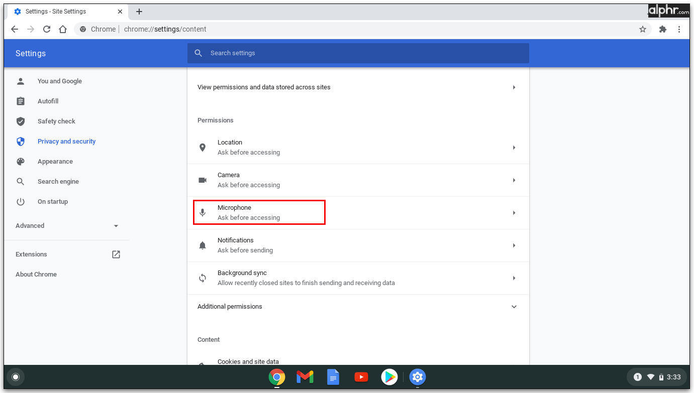 - There, you’ll have different settings that you can adjust. Before you click on “Microphone,” you can switch the toggle next to the “Ask before accessing” option to make sure the permissions are in place.